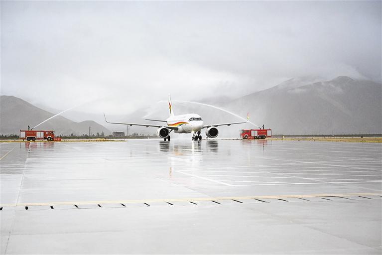 援藏入境旅游包機在日喀則和平機場過“水門”。
