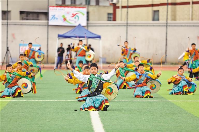 日喀則市學生為足球友誼賽加油助威。
