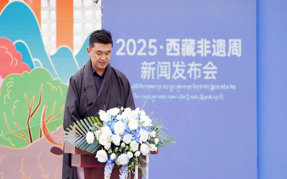 圖為西藏非物質(zhì)文化遺產(chǎn)保護(hù)與發(fā)展協(xié)會(huì)秘書長(zhǎng)旦桑在發(fā)布會(huì)現(xiàn)場(chǎng)致辭。(受訪者供圖)