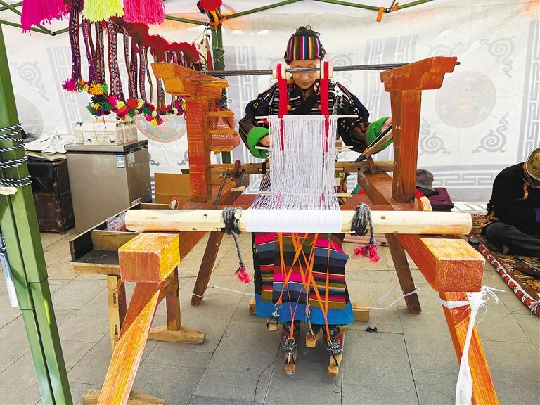 在措美縣非遺展示活動(dòng)現(xiàn)場(chǎng),扎雜村村民在演示織氆氌。