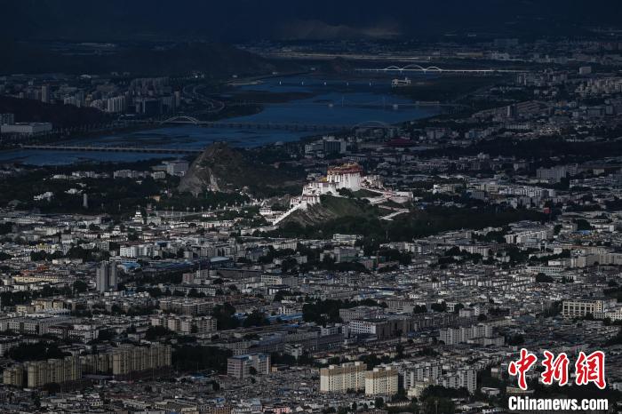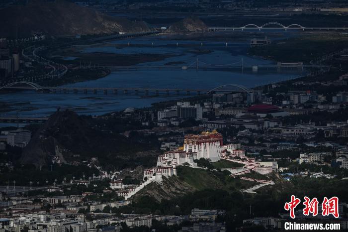 7月5日清晨,西藏拉薩市在薄霧中朦朧蘇醒,天際線泛起粉紫色霞光。布達(dá)拉宮在朝陽的映照下美景如畫。中新社記者 貢嘎來松 攝