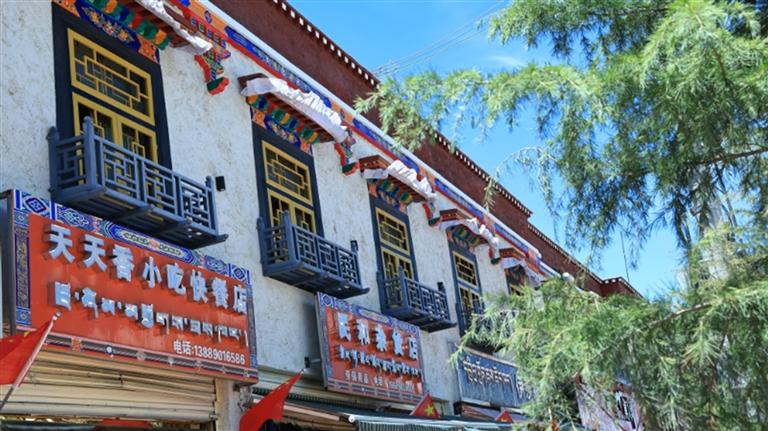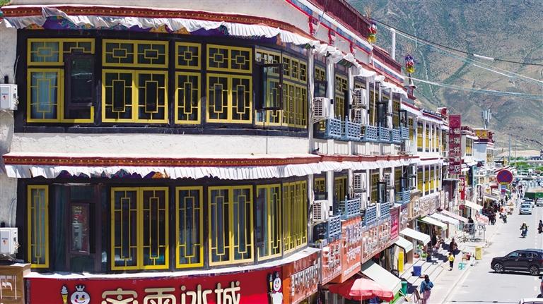 值得關(guān)注的是,此次修復(fù)及新建的商鋪外立面特意采用傳統(tǒng)藏式繪畫(huà)工藝,選用新藏式風(fēng)格,旨在弘揚(yáng)獨(dú)特的當(dāng)?shù)匚幕?,使其在現(xiàn)代城市中展現(xiàn)新活力。通過(guò)外立面裝飾改造形成統(tǒng)一風(fēng)格后,老舊街區(qū)的藏式特色更加凸顯。