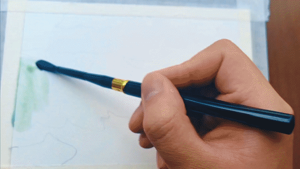 展開畫紙,最先捕捉到的是夏日魯朗層次豐富的綠意:嫩綠的草地鋪展開來,湖水映出清澈的藍(lán)綠色澤,遠(yuǎn)處的山巒泛著淡淡青色,層層疊疊。道路在明媚的陽光下,潔白如雪,在綠色中蜿蜒,串聯(lián)起一個(gè)個(gè)藏式村落。