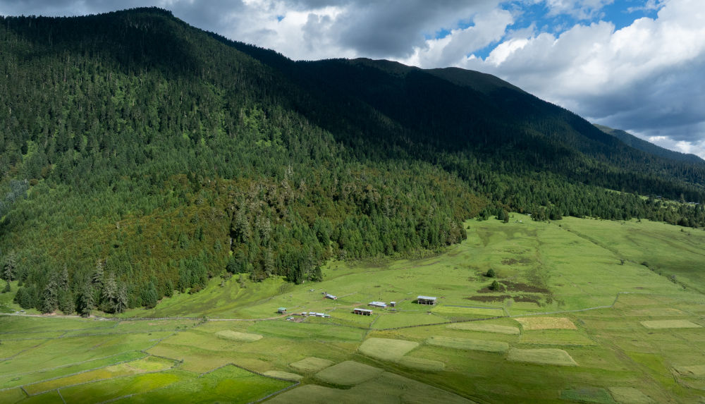 俯瞰扎西崗村旁的花海牧場(chǎng)(無人機(jī)照片)。新華社記者 丁增尼達(dá) 攝