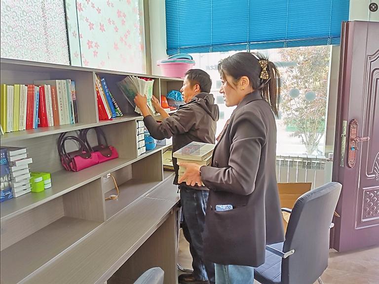 圖為措美鎮(zhèn)當許社區(qū)黨員志愿者在驛站內(nèi)擺放圖書和充電器等供群眾免費使用。記者 丹增平措 攝