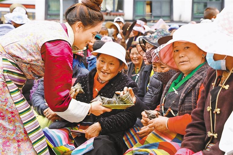圖為今年端午節(jié)期間,洛扎縣委宣傳部、縣文旅局在德瑪龍村舉辦“培樹(shù)文明向上新風(fēng)·崇尚健康幸福生活”系列活動(dòng),為新村居民送粽子,以弘揚(yáng)傳統(tǒng)節(jié)日文化凝聚民族團(tuán)結(jié)奮進(jìn)力量。 圖/文 記者 丹增平措