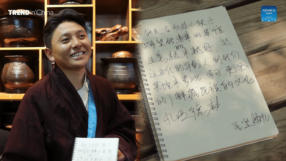 吾堅(jiān)曲扎和他在筆記本上寫下的話。新華社發(fā)