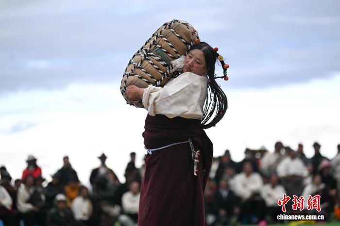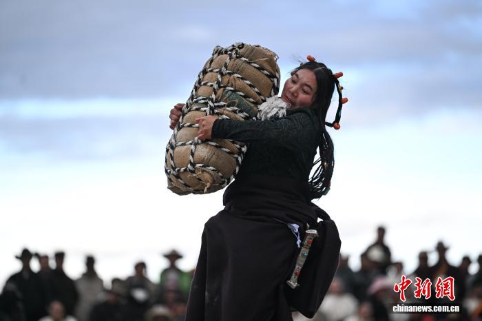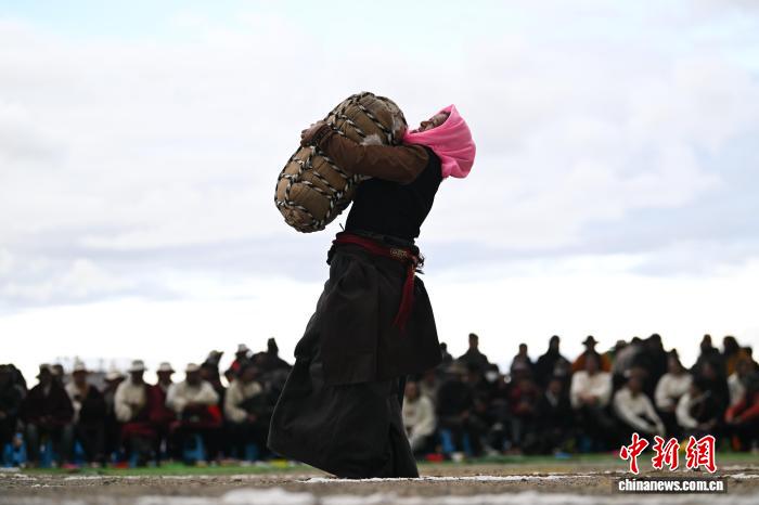9月5日,2025年那曲市恰青賽馬節(jié)在格薩爾賽馬場(chǎng)開(kāi)幕。當(dāng)日,賽場(chǎng)中不僅有駿馬飛馳,更有力量的精彩較量。在抱石頭比賽現(xiàn)場(chǎng),來(lái)自那曲市各縣(區(qū))的男女選手們鼓足干勁,挑戰(zhàn)自我。這項(xiàng)傳統(tǒng)體育項(xiàng)目,展現(xiàn)了藏北人民的堅(jiān)韌與力量。圖為女參賽選手在抱石頭比賽。中新社記者 貢嘎來(lái)松 攝