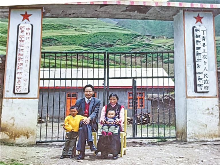 1988年,阿旺慈誠(chéng)和妻子、孩子在上衣鄉(xiāng)政府門(mén)前的合影。(圖片由受訪者提供)