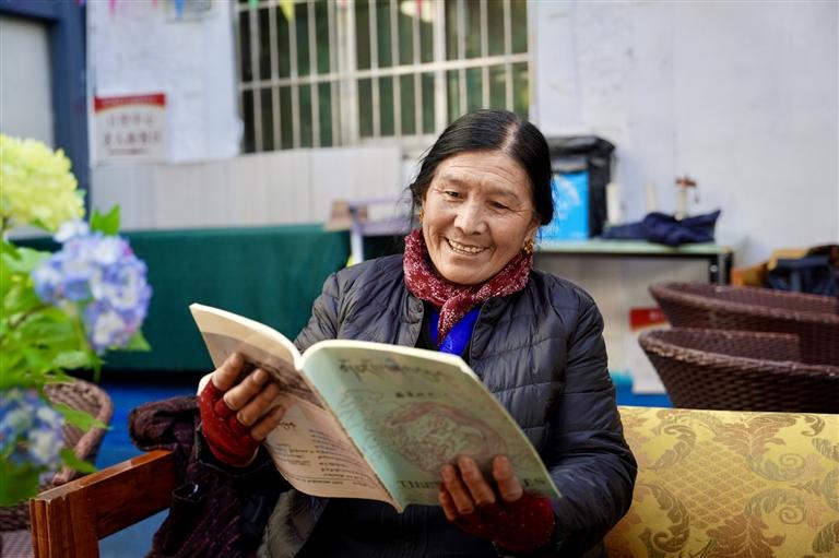 老人在日間照料中心看書(shū)。圖/記者 貢曲羅杰