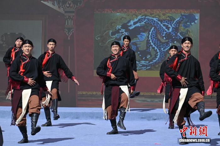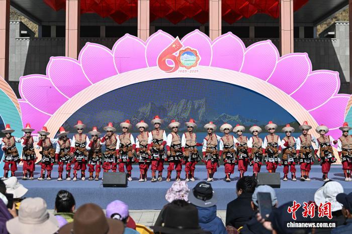 圖為阿里地區(qū)改則縣藝術(shù)團(tuán)表演舞蹈《歡舞幸?!じ膭t情》。中新社記者 貢嘎來松 攝