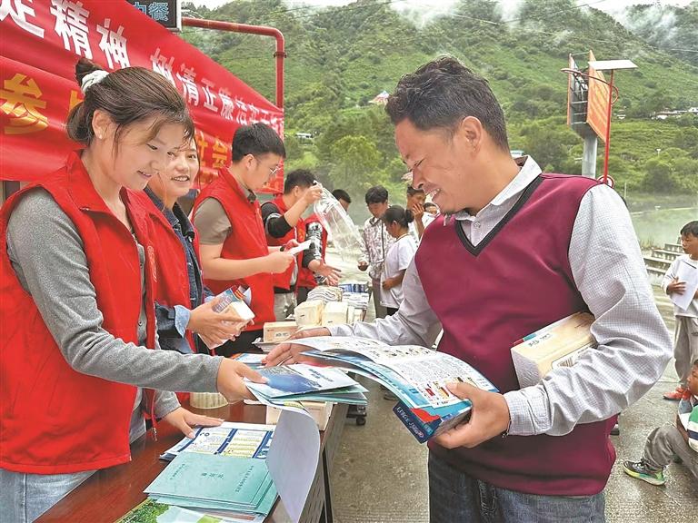圖為林芝市墨脫縣格當(dāng)鄉(xiāng)黨委、政府工作人員向群眾發(fā)放宣傳品。記者 王敏 攝