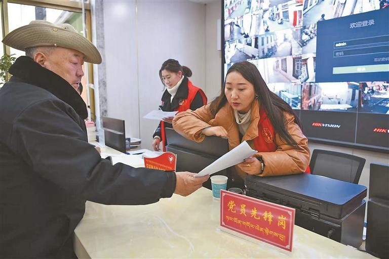 圖為拉薩市城關(guān)區(qū)策門林社區(qū)服務(wù)大廳工作人員為社區(qū)群眾服務(wù)。記者 唐斌 攝