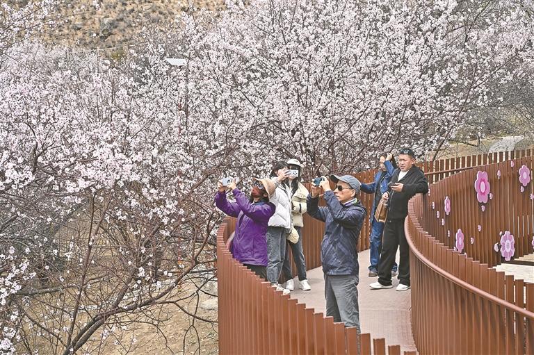 游客在林芝嘎拉桃花源拍照游玩。記者 次仁平措 攝