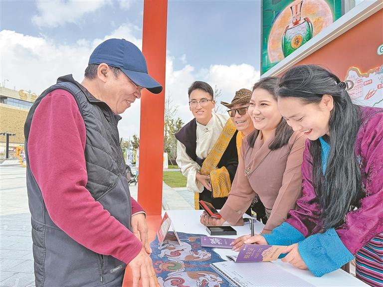 “萬人墨竹探親游”活動的探親證發(fā)放處人潮擁擠,排隊申請領(lǐng)證的市民絡(luò)繹不絕?!拔覀儨?zhǔn)備了1萬本免費發(fā)放的探親證,探親證上詳細(xì)介紹了紅色文化游、藍(lán)色康養(yǎng)游、綠色生態(tài)游、文化探秘游、墨竹深度游精品線路的詳細(xì)內(nèi)容供大家選擇。屆時,我們將準(zhǔn)備好香甜的青稞酒、潔白的哈達(dá)、美味的藏餐等候咱們南京的兄弟姐妹回雪域高原的墨竹家中看看、坐坐。”墨竹工卡縣文化旅游公司負(fù)責(zé)人扎西措姆在探親證發(fā)放現(xiàn)場介紹道。