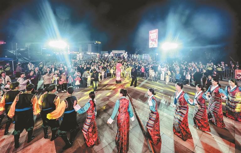 圖為萬人鍋莊晚會現(xiàn)場,南京市民與墨竹工卡縣松贊藝術(shù)團(tuán)演職人員一起跳鍋莊。