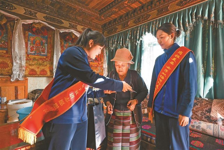 圖為崗拉美朵女子雙語志愿服務隊開展“敲門入戶”行動,向居民細致講解家庭用火、用電、用氣安全須知,傳授初起火災撲救技巧及火場自救逃生方法。倉瓊 通訊員 孫成仲 攝
