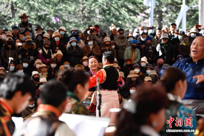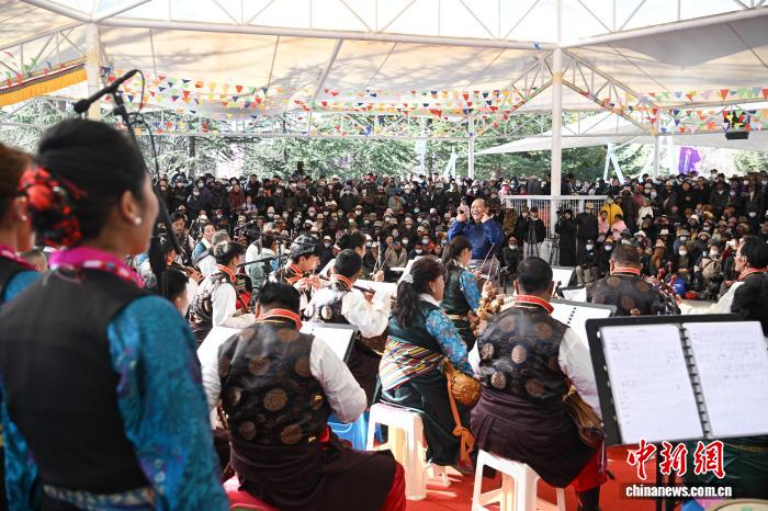 12月20日,為熱烈慶祝西藏自治區(qū)成立60周年,由西藏自治區(qū)文化和旅游廳主辦的格?;ㄑ莩黾尽履辍拔覀兊墓?jié)日 群星薈萃”群眾音樂會在拉薩宗角祿康公園精彩上演。音樂會節(jié)目豐富多樣,涵蓋民樂合奏、少兒藏戲、獨唱重唱等多種形式。傳統(tǒng)韻味與時代氣息交融,各族群眾以歡歌贊頌發(fā)展巨變,共迎美好新年。圖為群眾音樂會現(xiàn)場。中新社記者 貢嘎來松 攝