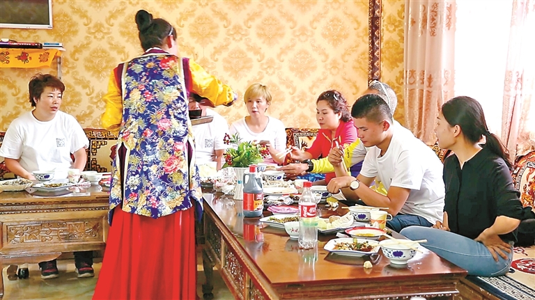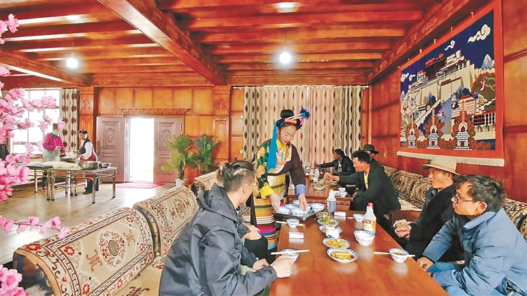 作為自治區(qū)級非遺傳承人、芒康縣“婦女致富帶頭人”的卓瑪拉姆,于2010年開辦鹽井果拉叢農(nóng)家樂,憑借著正宗的加加面風(fēng)味和熱情的服務(wù),逐漸積累了口碑。2012年,在各級政府的支持下,她采用“民族特色餐飲+鄉(xiāng)村旅游接待”的經(jīng)營模式,生意日益紅火。2017年,通過貸款300萬元、自籌160萬元翻建了農(nóng)家樂,將其升級為綜合型的民族特色餐飲店,經(jīng)營規(guī)模大幅擴(kuò)大,最多時日接待游客達(dá)300余人。