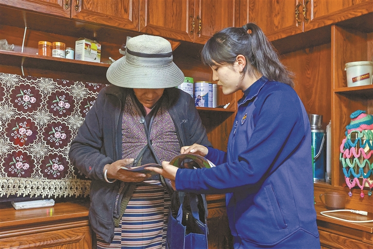 圖為崗拉美朵女子雙語志愿服務(wù)隊(duì)開展“敲門入戶”行動。記者 王香香 見習(xí)記者 土旦仁青 攝