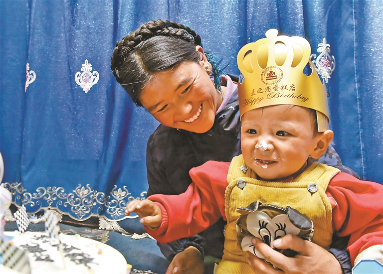 圖為1月8日,母親朋瓊正在為地震寶寶次仁拉巴過(guò)生日。記者 旦增蘭澤 攝
