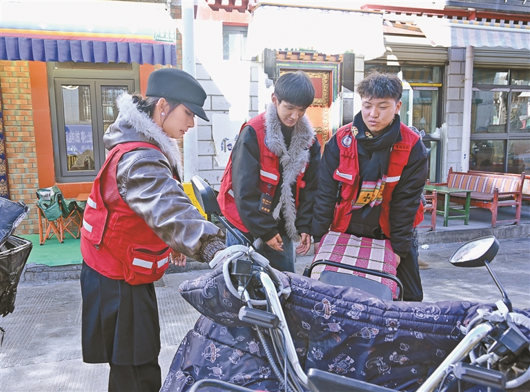 圖為冬日里,拉薩市城關(guān)區(qū)雪社區(qū)網(wǎng)格員正排查安全隱患,疏通社區(qū)道路,保障群眾便捷出行。記者 王敏 攝