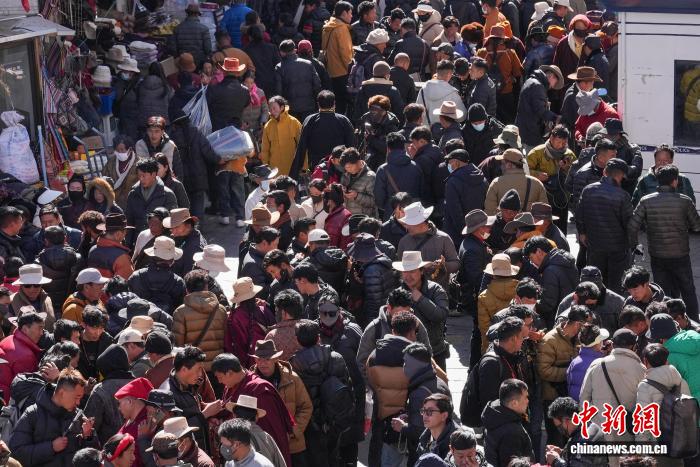1月27日,藏歷新年將至,拉薩街頭年味漸濃。城區(qū)街巷燈籠高掛,市民忙著采購(gòu)酥油花、香布、切瑪盒、吉祥羊頭、藏文春聯(lián)等特色年貨,各式新年好物琳瑯滿目,處處洋溢著喜慶祥和的節(jié)日氛圍,人們以傳統(tǒng)方式迎接新年到來。圖為拉薩沖賽康市場(chǎng)前來選購(gòu)年貨的民眾絡(luò)繹不絕。貢確 攝