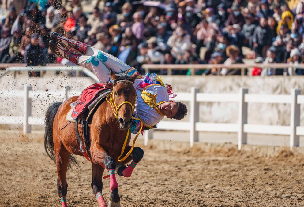 2月20日,馬術(shù)隊(duì)員在表演傳統(tǒng)馬術(shù)技巧。新華社記者 丁增尼達(dá) 攝