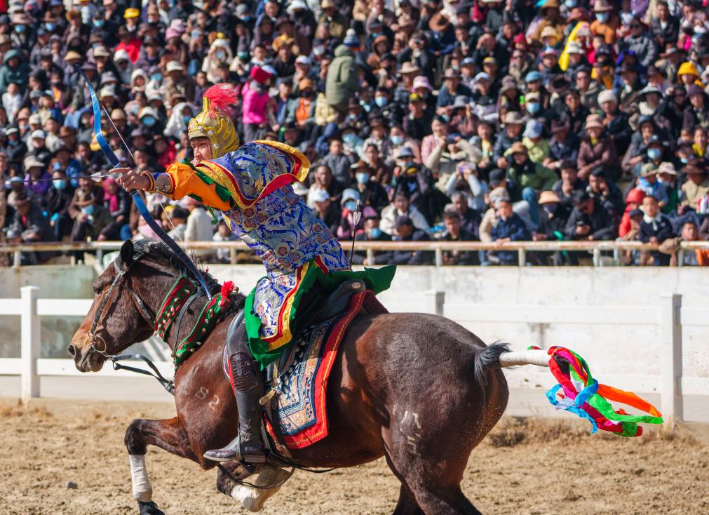 2月20日,馬術(shù)隊(duì)員在表演馬背傳統(tǒng)響箭技巧。新華社記者 丁增尼達(dá) 攝