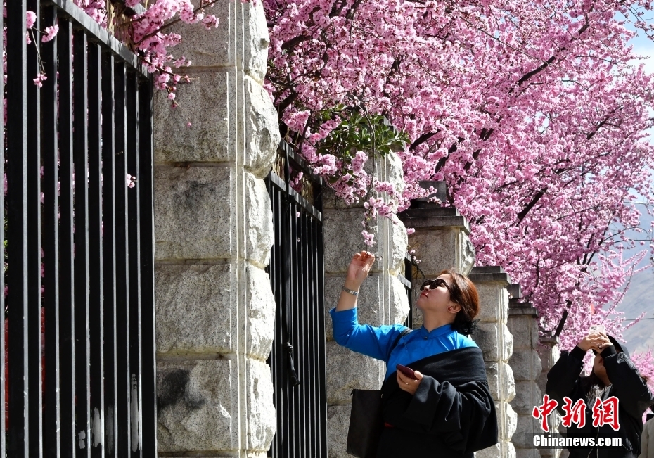 4月1日,市民在春花綻放的道路旁賞花。隨著雪域高原天氣回暖,西藏拉薩市區(qū)各條道路春花綻放。