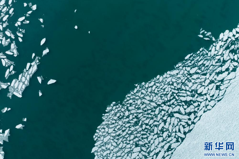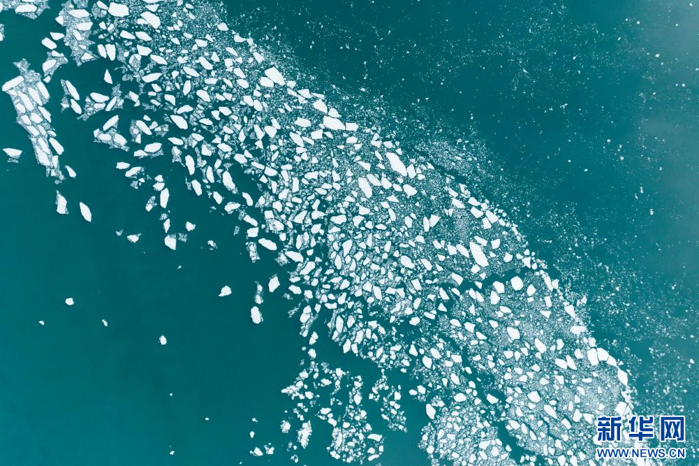 1月29日拍攝的瑪旁雍錯湖面上的冰堆積在一起,呈現(xiàn)出各式各樣的造型(無人機照片)。新華網(wǎng) 旦增努布 攝