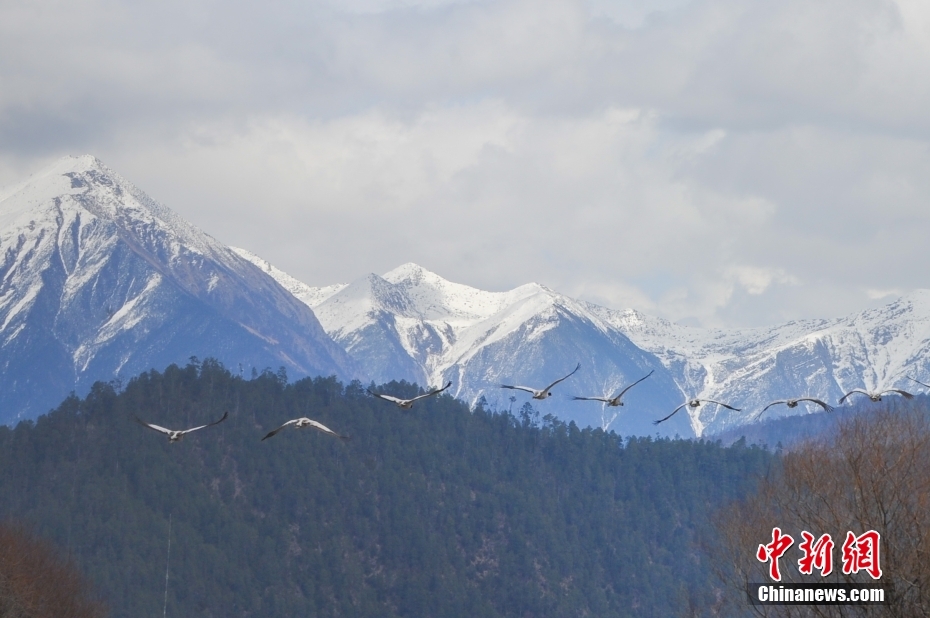 3月30日,在西藏林芝市巴宜區(qū)更章門巴民族鄉(xiāng),黑頸鶴與周邊的村莊、桃花、雪山融為一體,成為春日里的一道靚麗的風(fēng)景線。圖為在雪山前飛翔的黑頸鶴。