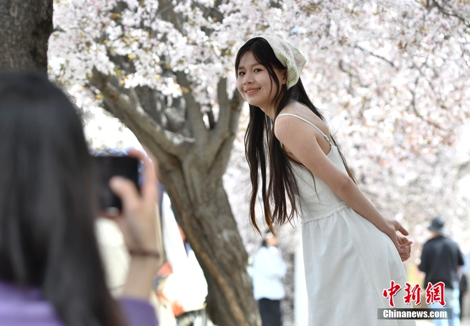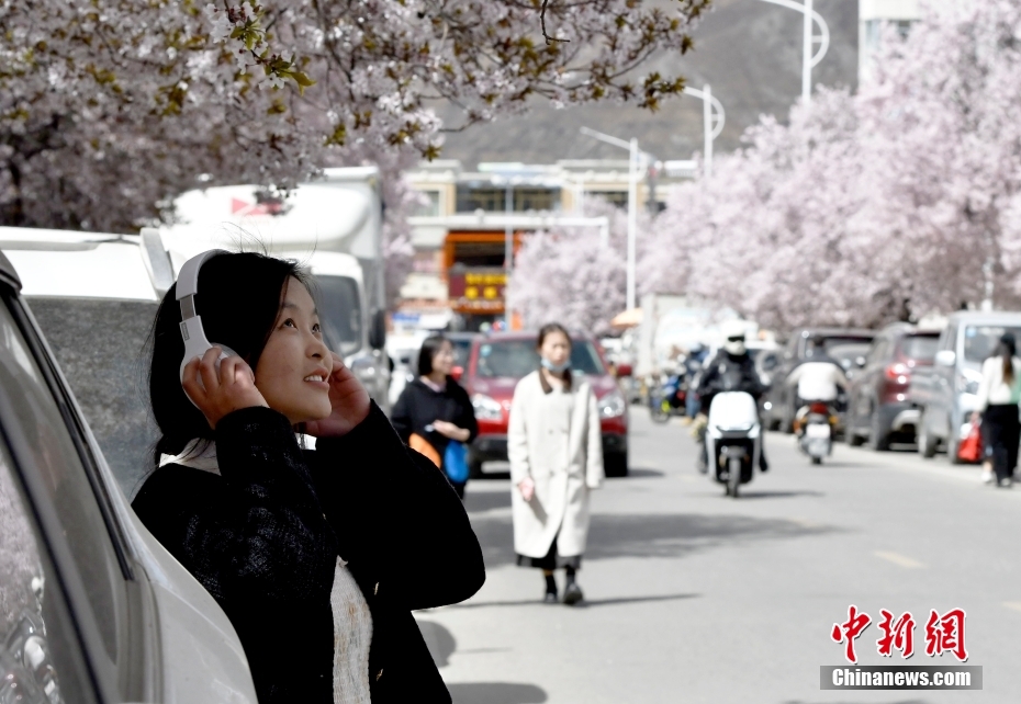 4月1日,市民在春花綻放的道路旁賞花。隨著雪域高原天氣回暖,西藏拉薩市區(qū)各條道路春花綻放。因道路兩側繁華似錦,拉薩市城關區(qū)軍民路成網(wǎng)紅打卡地,市民游客紛紛前來打卡拍照。