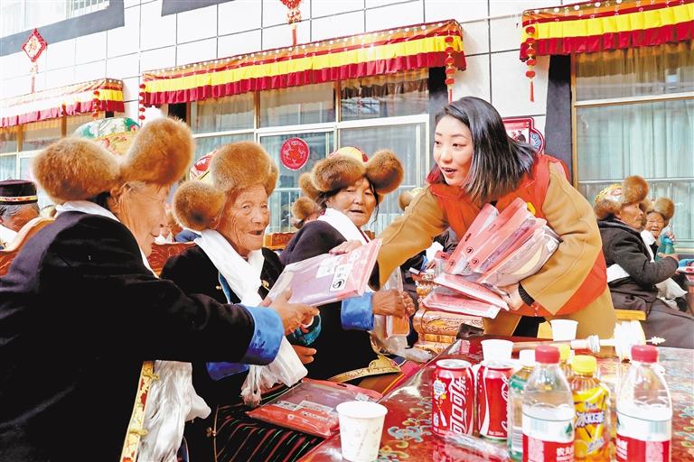 圖為山南市瓊結(jié)縣各單位在縣集中供養(yǎng)中心聯(lián)合舉辦慶元宵活動,為供養(yǎng)中心老人分發(fā)保暖衣物。記者 洛桑 通訊員 次仁龍布 攝