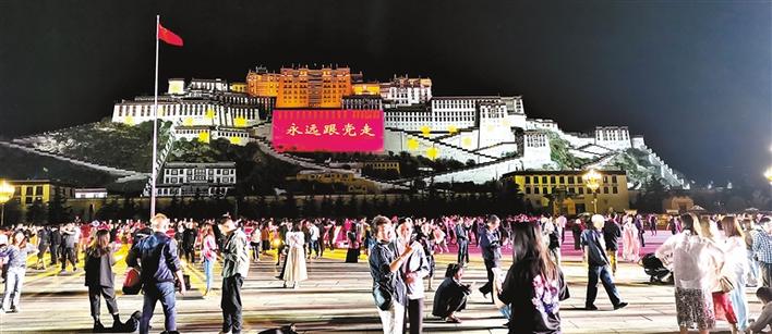 投影在布達拉宮上的“永遠跟黨走”宣傳標(biāo)語。記者 劉慶順 攝