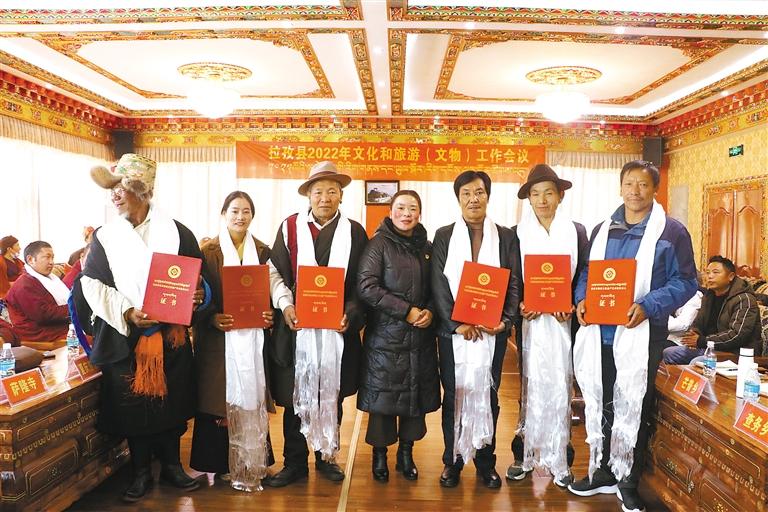 會議總結了拉孜縣2021年度文化和旅游(文物)相關工作,向8家文化企業(yè)發(fā)放了市級文化產(chǎn)業(yè)示范基地牌子;7支藏戲隊發(fā)放藏戲傳習點牌子;30家文保單位發(fā)放了文保單位全景圖;8名非遺傳承人發(fā)放了非遺傳承人證書。