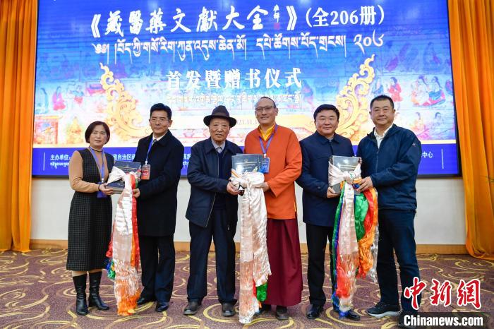 圖為 《藏醫(yī)藥文獻(xiàn)大全》首發(fā)暨贈書儀式現(xiàn)場。貢嘎來松 攝