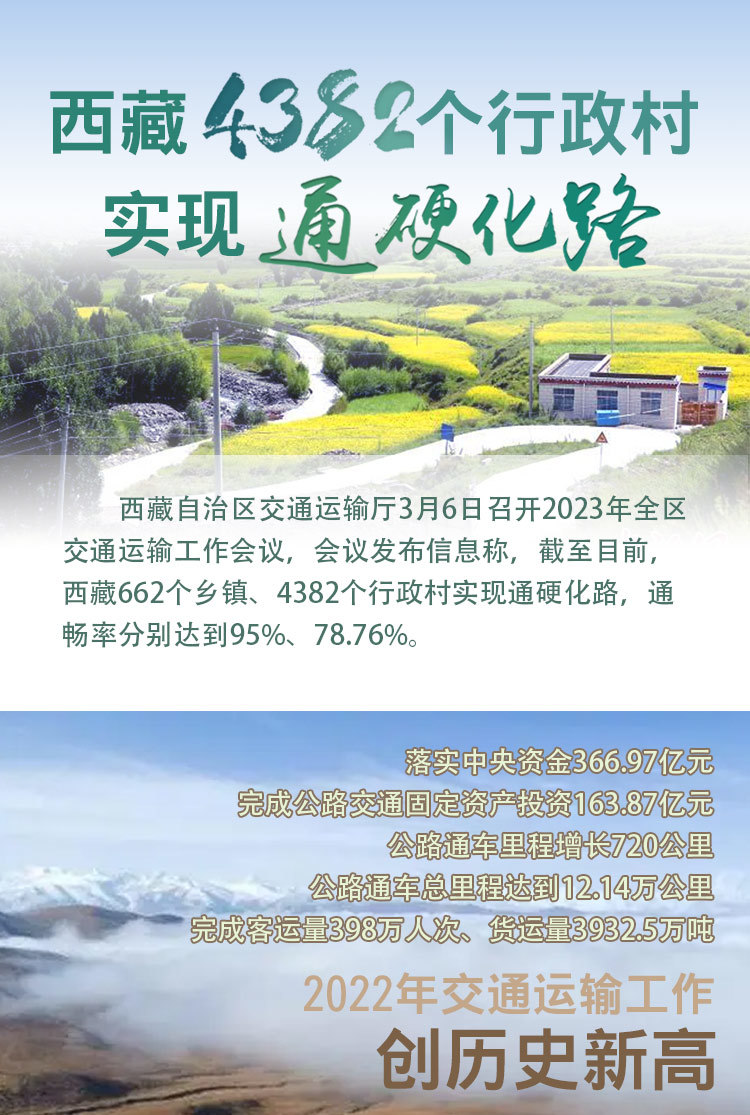 西藏自治區(qū)交通運(yùn)輸廳3月6日召開2023年全區(qū)交通運(yùn)輸工作會議,會議發(fā)布信息稱,截至目前,西藏662個鄉(xiāng)鎮(zhèn)、4382個行政村實(shí)現(xiàn)通硬化路,通暢率分別達(dá)到95%、78.76%。 [詳細(xì)] -