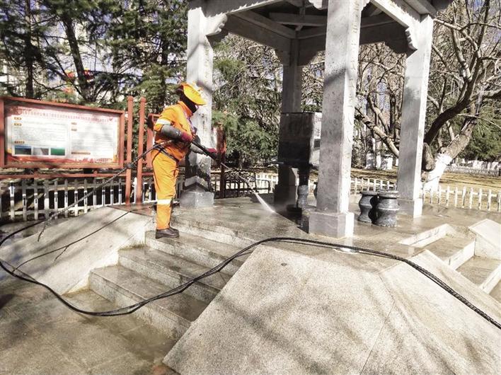 2月13日早上10點,由西藏拉薩市城關區(qū)環(huán)衛(wèi)局局長米瑪次仁牽頭,拉薩市城市建設投資經(jīng)營有限公司相關領導配合,調(diào)動50名保潔人員、4臺高壓沖洗車和1輛8噸灑水車,對宗角祿康公園內(nèi)原市民活動區(qū)域進行擦、沖、洗作業(yè)。