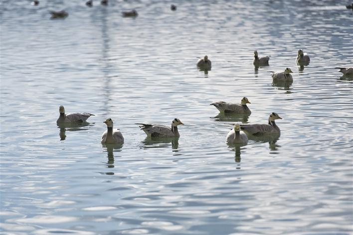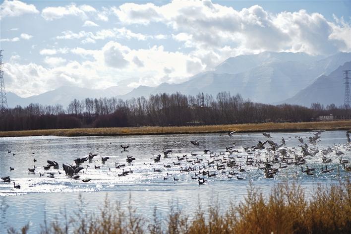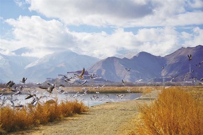 遠(yuǎn)處,連綿起伏的山頂還覆蓋著薄薄的積雪,布達(dá)拉宮雄偉而秀美;近處,濕地內(nèi)隨意顯現(xiàn)出的一塊塊水泊,成群的候鳥(niǎo)在水中玩耍嬉戲、在藍(lán)天白云下飛舞。見(jiàn)到可愛(ài)的飼養(yǎng)員帶來(lái)它們喜歡的麥粒,斑頭雁、紅隼、赤麻鴨、黃鴨等紛紛游上岸來(lái),盡情地享受美食,發(fā)出歡快的叫聲。