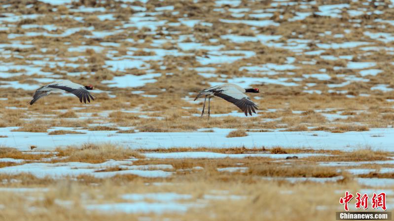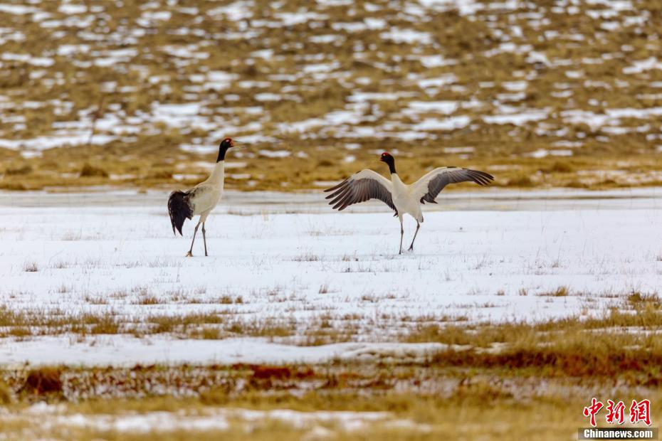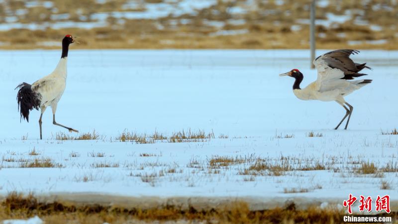 圖為黑頸鶴在草原上嬉戲。 張良英 攝