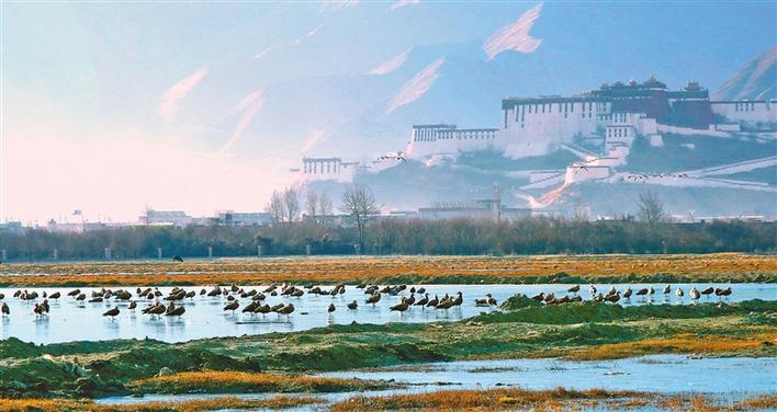遠(yuǎn)處,連綿起伏的山頂還覆蓋著薄薄的積雪,布達(dá)拉宮雄偉而秀美;近處,濕地內(nèi)隨意顯現(xiàn)出的一塊塊水泊,成群的候鳥在水中玩耍嬉戲、在藍(lán)天白云下飛舞。見到可愛的飼養(yǎng)員帶來它們喜歡的麥粒,斑頭雁、紅隼、赤麻鴨、黃鴨等紛紛游上岸來,盡情地享受美食,發(fā)出歡快的叫聲。