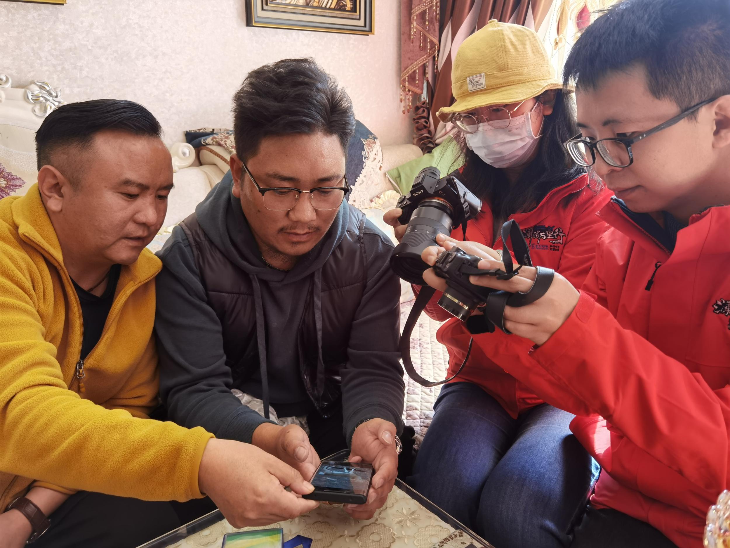 尕松義西(左二)給瀾湄萬(wàn)里行中外記者翻看手機(jī)中野生動(dòng)物的照片
