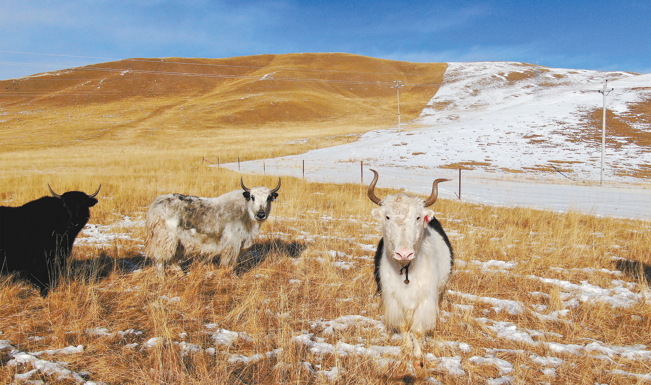 幾頭牦牛在雪后的草原上活動(dòng)。