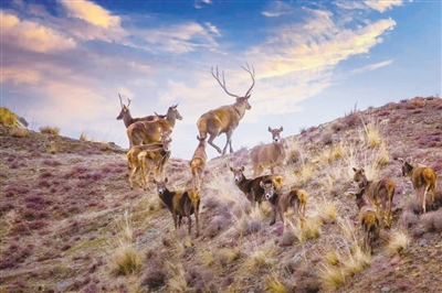 圖為在德令哈市雅撒圖地區(qū)成群結(jié)隊(duì)的白唇鹿在山上自由奔跑、覓食?!〈饔婪濉z