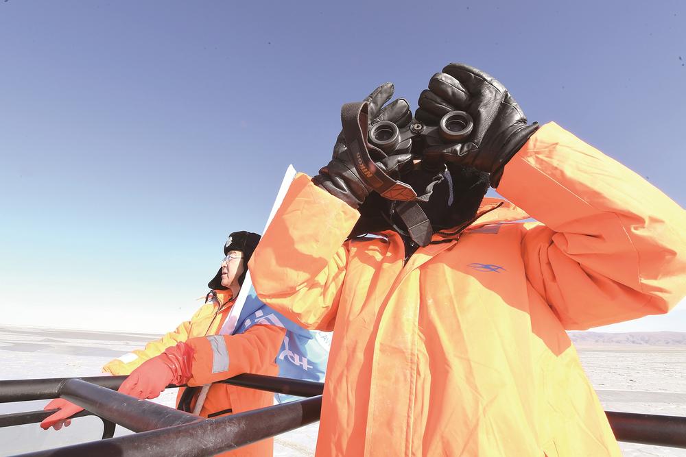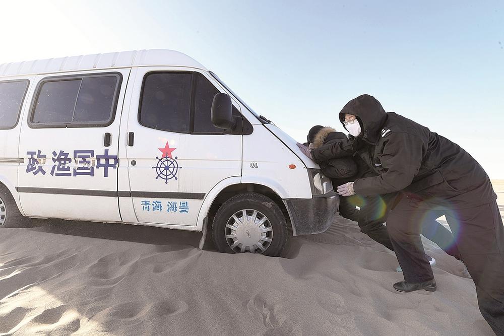 車緩緩駛向青海湖深處,即使穿得這么厚實,但寒風(fēng)襲來時,巡湖隊員們依舊被凍得直哆嗦。