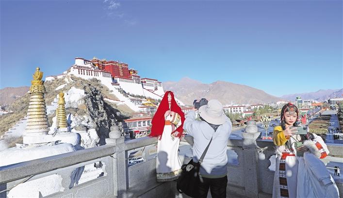 圖為游客在布達拉宮前拍照留念。格桑倫珠 攝