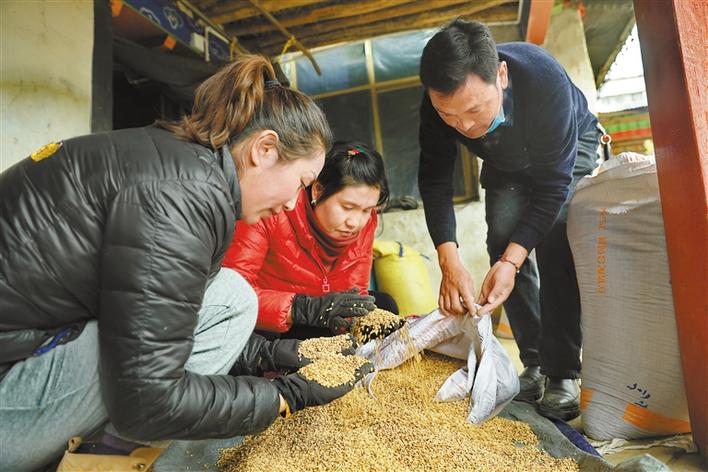 圖為墨竹工卡縣農(nóng)業(yè)農(nóng)村局(農(nóng)業(yè)技術(shù)推廣站)工作人員選購青稞種子。洛桑克珠 唐斌 攝