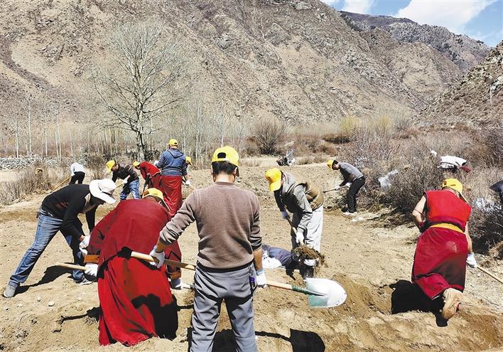 日前,加查縣瓊果杰寺管會(huì)以“助力春耕生產(chǎn),共建美麗家園”為主題,組織寺管會(huì)工作人員和僧人赴加查鎮(zhèn)扎西定崗村與群眾一起進(jìn)行春耕生產(chǎn)。