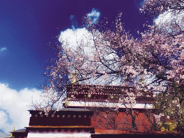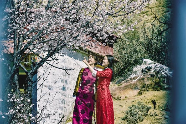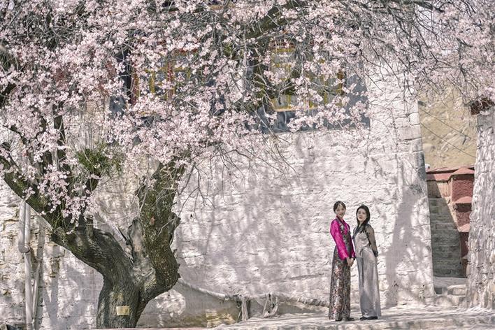 這里雖然沒有漫山遍野桃花次第盛開,但有花團(tuán)錦簇、桃紅柳綠,幾棵桃樹,一陣春風(fēng)吹過,花瓣如雨。身著藏裝的姑娘,與桃花合影,共赴春天的約會(huì),看上去頗有些妖嬈的味道。